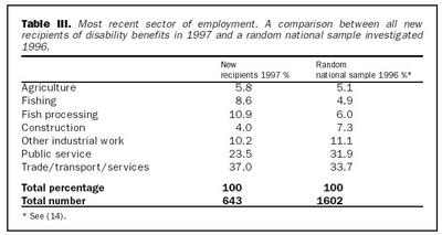 Í töflu III kemur fram í hvaða atvinnugrein öryrkjarnir starfa eða störfuðu síðast. Þar má sjá athygliverðan mun á öryrkjum og þjóðinni. Öryrkjar koma í meiri mæli úr fiskveiðum og fiskvinnslu en þjóðin almennt og í minni mæli úr opinberri þjónustu og byggingariðnaði. Heldur stærri hluti öryrkja starfaði við verslun, samgöngur og þjónustu en þjóðin á árinu 1996 (14).