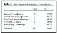 Opnunartíðni: Snúa þurfti 16 (4,0%) kviðsjáraðgerðum í opna aðgerð. Einungis 11 (3,1%) valaðgerðum var breytt í opna aðgerð (95% öryggisbil: 1,3-4,8) á móti fimm (12,2%) bráðaaðgerðum (95% öryggisbil: 2,2-22,2). Ábendingar fyrir breytingu í opna aðgerð má sjá í töflu II.