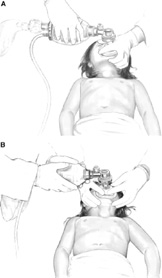 Mynd 5. Andað fyrir barn með belg og maska. A: Einn sér um öndunaraðstoð.