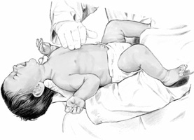 Mynd 7. Hjartahnoð á ungbarni með tveimur fingrum sömu handar þegar einn er að endurlífga.