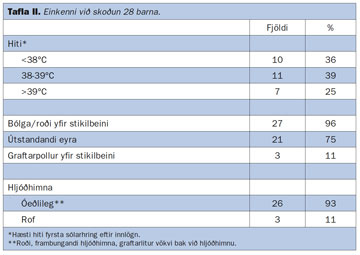 Börnin höfðu haft einkenni stikilbólgu að meðaltali í 1,5 daga fyrir greiningu (staðalfrávik 1,2 dagar). Fimm börn höfðu haft einkenni lengur en einn dag. Í töflu II er greint frá einkennum er börnin höfðu við greiningu.