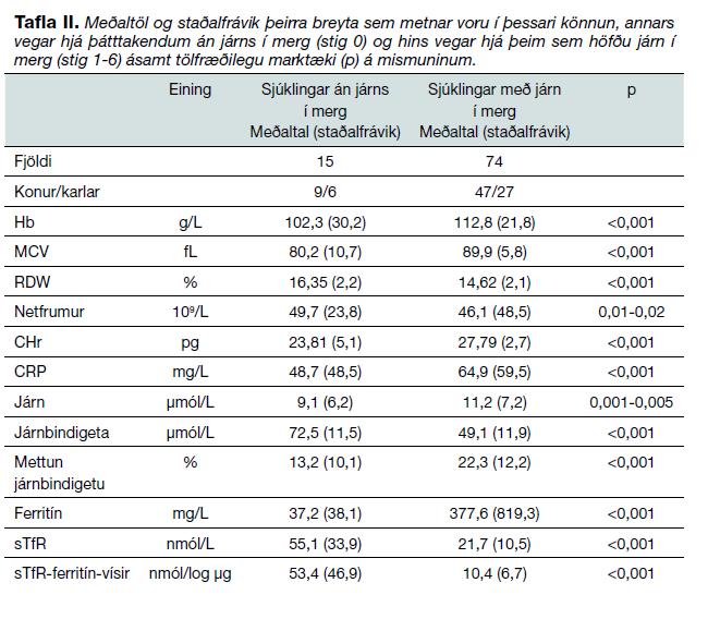 Í töflu II koma fram meðaltöl og staðalfrávik þeirra breyta sem skoðaðar voru í þessari könnun, annars vegar hjá sjúklingum án járns í merg (stig 0) og hins vegar hjá sjúklingum með járn í merg (stig 1 til 6) ásamt tölfræðilegu marktæki á mismun. Tölfræðilega marktækur munur (p<0,05) var á meðaltali allra breytanna.