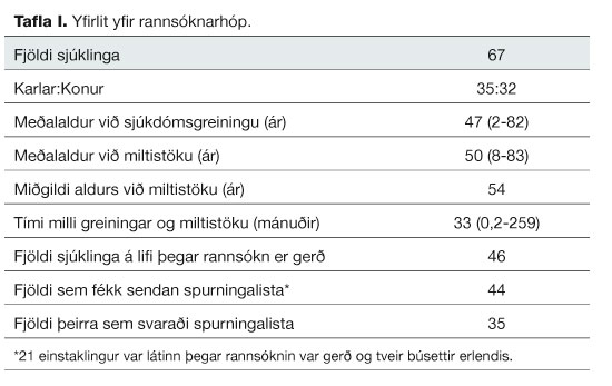 Niðurstöður: Meðalaldur við aðgerð var 50 (8-83) ár. Karlar voru 35 og konur 32. Svörun spurningalista var 80%.