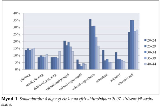 Einkenni eftir aldri: Mynd 1 sýnir hlutfall einkenna eftir aldri árið 2007. Næturhósti og astmaköst eru marktækt algengari í yngsta aldurshópum en hinum (p<0,0001 og p<0,01). Þessi háa tíðni einkenna meðal þeirra yngstu var ekki til staðar árið 1990.14