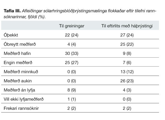 Tafla III sýnir til hvaða aðgerða var gripið eftir að niðurstöður sólarhringsblóðþrýstingsmælinga lágu fyrir, flokkað eftir tilefni rannsóknarinnar, það er hvort rannsóknin var gerð til að greina háþrýsting eða hvort um eftirlit var að ræða.