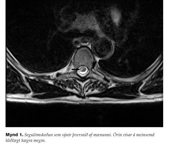 Í framhaldi af taugaskoðun þótti rétt að útiloka meinsemd í framheila vinstra megin (hreyfisvæði ganglims gagnstæðrar hliðar) vegna einangraðrar lömunar í hægri ganglim. Tölvusneiðmyndarannsókn af heila gaf engar vísbendingar um ferskt drep eða blæðingu. Þá vaknaði grunur um drep í mænu. Segulómrannsókn leiddi í ljós segulskynsbreytingar hægra megin í mænu, greinilegast í hæð við brjóstliðbol 4 (mynd 1). Síðar var gerð Holter-rannsókn og ómun af hjarta og voru rannsóknaniðurstöður eðlilegar.