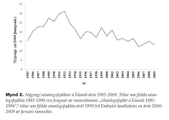 Nýgengi utanlegsþykktar jókst um allan heim frá árunum kringum 1970 og fram yfir 1990 og tvö- til fjórfaldaðist í Evrópu og á Norðurlöndunum.1-4 Á Íslandi sást sama þróun fram til ársins 1992, með aukningu úr 6,3/1000 skráðar þunganir 1968-1972 í um 31,1/1000 árið 1992, sem var nær fimmföld aukning.5,6 Á síðustu tveimur áratugum hefur nýgengið víðast hvar farið lækkandi,1,2,4,7 eða staðið í stað.8