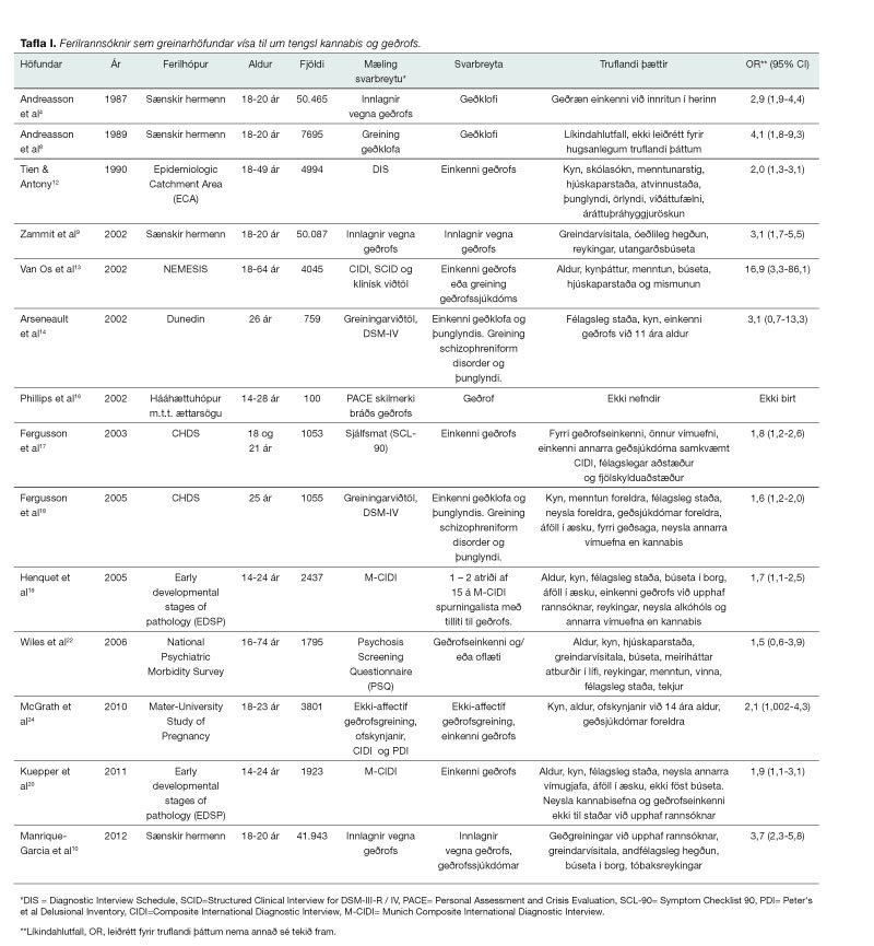 Árið 2003 birtu Fergusson og samverkamenn grein um tengsl kannabisnotkunar og geðrofseinkenna.17 Notuð voru gögn úr CHDS sem aflað var við 18 ára og 21 árs aldur. Staðlaðir spurningalistar voru notaðir til mats og var tímasetningu kannabisnotkunar og geðrofseinkenna gerð góð skil. Niðurstöður voru að einstaklingar sem notuðu kannabis voru marktækt líklegri til að hafa fengið geðrofseinkenni. Leiðrétt líkindahlutfall reyndist 1,8 (95%CI 1,2-2,6) (tafla I).