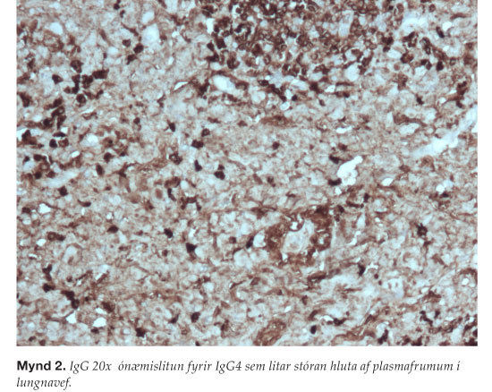 Vefjasýni frá sjúklingnum sem send voru til MGH í Boston sýndi, þegar gerð var sérhæfð litun, áberandi IgG4-jákvæðar eitilfrumur ( mynd 2 ). Sjúklingurinn var meðhöndlaður í apríl 2013 með rituximab, 1000 mg gefið í æð í tvö skipti með tveggja vikna millibili. Einnig voru gefnir sterar um munn. Sterarnir voru minnkaðir niður í ekkert seinni part þess árs. Sjúklingurinn hefur síðan verið án meðferðar við góða líðan. Tölvusneiðmynd af lungum tekin í febrúar 2015 sýndi nánast eðlilegt ástand (mynd 3 ). Síðustu blóðprufur frá febrúar 2017 voru eðlilegar: CRP <3g/L og sökk 2 mm/klst.