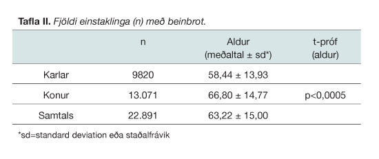 Á 10 ára tímabili, frá 2002 til og með 2011, greindust 29.056 beinbrot hjá 22.891 einstaklingum samkvæmt gögnum úr Sögu. Aldur, kyn, tegund og fjöldi brota er sýndur í töflu I . Í töflu II má sjá að konur eru fleiri en karlar og að þær eru marktækt eldri. Hópnum sem tók lyfin án beinbrota er lýst í töflu III . Þar eru konur einnig í meirihluta og marktækt eldri þótt munurinn sé minni en í brotahópnum. Hópurinn sem brotnaði var marktækt eldri (63 ± 15 ár) en þeir sem ekki brotnuðu (60 ± 13 ár). Tafla IV sýnir fjölda brota og hvernig þau flokkast miðað við hvert lyf og kyn sjúklinganna. Konur eru í flestum tilfellum mun fleiri en karlar, nema hvað varðar statín. Flest brotin tengjast töku svefn- og róandi lyfja. Fáir virðast brotna eftir töku H2-andhistamína en það gæti endurspeglað að notkun þeirra er lítil í samfélaginu.