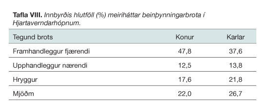 Tafla VIII sýnir innbyrðis hlutföll helstu beinþynningarbrotanna í Hjartaverndarrannsókninni. Hlutföllin héldust svipuð hvort sem um var að ræða fyrsta eða seinni brot.