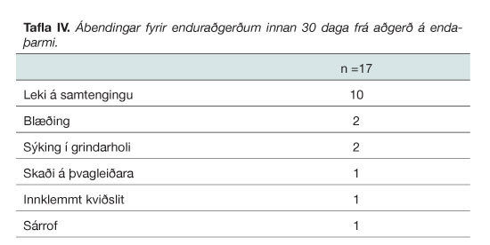 Þörf var á enduraðgerð innan 30 daga í 17 tilfellum (11,8%). Leki á samtengingu átti sér stað í 15 tilfellum (15,5%) af þeim 97 sjúklingum sem fengu samtengingu. Ástæða enduraðgerða var oftast leki á samtengingu (n=10) en tafla IV tiltekur ábendingar fyrir enduraðgerðum. Í 5 tilfellum var leki á samtengingu meðhöndlaður án aðgerðar. Eitt dauðsfall átti sér stað innan 30 daga (0,7%) en um var að ræða 83 ára mann með fjölþætta heilsufarssögu sem lést 14 dögum eftir útskrift af spítalanum af óljósum ástæðum. Dauði innan eins árs átti sér stað í 8 tilfellum (5,5%).