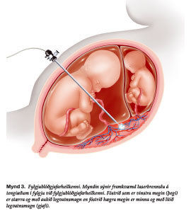 Fylgjublóðgjafarheilkenni (twin-twin transfusion syndrome, TTTS). Í eineggja tvíburaþungun (monochorionic-diamniotic, MC/DA) eru auknar líkur á röskun á blóðflæði á milli fóstra vegna óeðlilegra æðatenginga, með þeim afleiðingum að bæði fóstrin eru í verulegri hættu. Lykilatriði sem sjást við ómun eru monochorionic-fylgja með misræmi í legvatnsmagni, þar sem dýpsti lóðrétti legvatnspollur hjá fóstrunum er annars vegar <2 sm og hins vegar >8 sm. Án meðferðar eru verulegar líkur á dauða beggja fóstra, sérstaklega ef þungunin er skammt á veg komin og fóstrin hafa ekki náð lífvænlegri meðgöngulengd. Meðferð með laserbrennslu á tengiæðum í fylgju bætir horfur þó burðarmálsdauði sé enn hár hjá þessum hópi,39 sjá mynd 3 . TTTS kemur fyrir hjá allt að 15% MC/DA-tvíbura.40 Við fæðingu er einkennandi að annar tvíburinn er stærri, rauður á húð og með rauðkornadreyri (polycythemia). Hinn er minni, fölur á húð og blóðlaus. Sá er kallaður gjafi (donor) enda hefur hann sent blóð gegnum óeðlilegar tengiæðar yfir til hins tvíburans sem er þegi (recipient). Báðir líða fyrir ástandið en einkum sá stóri sem þolir ekki umframvökva og blóðmagn sem skapar mikið álag á hjarta og blóðrásarkerfi. Öllum konum með MC/DA- þungun er boðið að koma í ómskoðun á tveggja vikna fresti frá 16 vikna meðgöngu til að meta hvort TTTS sé í uppsiglingu, meðal annars með því að mæla blóðflæðishraða í miðhjarnaæð (middle cerebral artery) en hann eykst ef um blóðleysi er að ræða.34,41