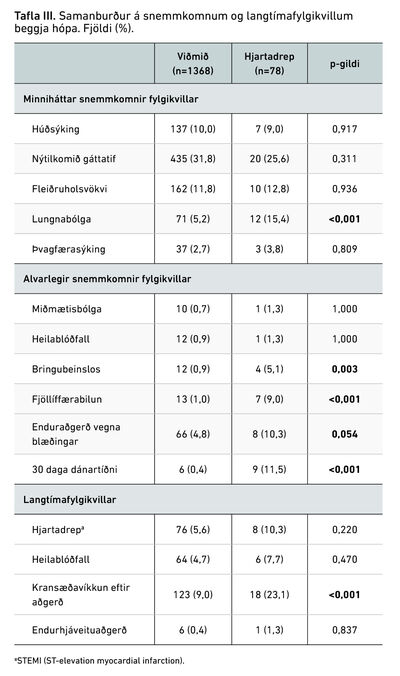 Tafla III sýnir samanburð á snemmkomnum og langtímafylgikvillum í hópunum tveimur. Hvað minniháttar fylgikvilla varðar, sást marktækt hærri tíðni lungnabólgu í hjartadrepshópi og af alvarlegum fylgikvillum (hjartadrep fráskilið) var marktækt hærri tíðni á bringubeinslosi og fjöllíffærabilunum. Hlutfall þeirra sem létust innan 30 daga frá aðgerð var mun hærra í hjartadrepshópi, eða 11,5% (n=9/78) borið saman við 0,4% (n=6/1369) í viðmiðunarhópi (p<0,001). Við samanburð langtímafylgikvilla þurfti 23,1% af sjúklingum í hjartadrepshópi að gangast undir kransæðavíkkun eftir aðgerð borið saman við 9% í viðmiðunarhópi (p<0,001). Sömuleiðis reyndist tíðni MACCE í hjartadrepshópi hærri (14,5% á móti 21,8%) 5 árum eftir aðgerð, (p=0,07), aðallega vegna hærri tíðni kransæðavíkkunar. Tíðni hjartaáfalls, heilablóðfalls og endur-hjáveituaðgerðar reyndist hins vegar sambærileg í hópunum.
