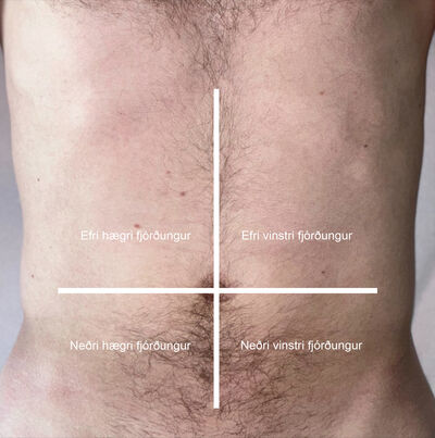 Hefðbundið er að skipta kviðarholi í níu svæði þegar lýsa á staðsetningu verkja, eymslum eða fyrirferðum við kviðskoðun (mynd 1). Önnur aðferð, og líklega algengari meðal lækna, er að skipta kviðnum upp í fjögur svæði, hægri og vinstri, efri og neðri fjórðung (mynd 2).