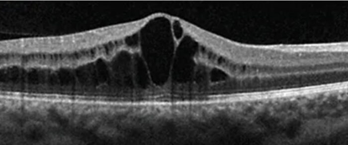 Mynd 3. OCT sýnir blöðru-sjónudepilsbjúg (cystoid macular edema, CME) sem getur orsakast meðal annars af sykursýki, bólgusjúkdómum í auga, bláæðalokun í sjónhimnu eða eftir augasteinaskipti.6