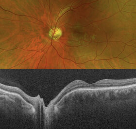 Mynd 2. Heilbrigt auga. Efri: Augnbotnamynd. Neðri: OCT af gula blettinum og sjóntaug.