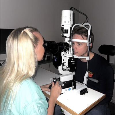 Mynd 1. Skoðun í raufarlampa. Sérnámslæknar gáfu leyfi fyrir mynd af sér.