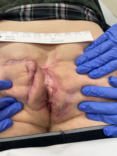 Sjúklingurinn er 63 ára karlmaður sem var vísað til ristilskurðlækna haustið 2022 vegna margra ára sögu um endurteknar sýkingar í báðum rasskinnum. Hann var með sögu um reykingar, langvinna lungnateppu og öndunarfærasýkingar ásamt ósæðargúli, meðhöndluðum með stoðneti. Þá var hann einnig með sögu um iktsýki sem var greind árið 2006. Hann var í upphafi meðhöndlaður með sterum og svo metótrexati. Árið 2007 var bætt við adalimumabi en því skipt út fyrir rituximab árið 2021 sem var gefið í æð tvisvar á ári. Þeirri meðferð var haldið áfram samhliða tilfallandi sýklalyfjakúrum en nokkrum sinnum þurfti að fresta lyfjagjöf vegna sýkinga. Hann hafði áður verið grunaður um tvíburabróður eða fistla frá endaþarmi og þurfti að tæma graftarkýli oftar en einu sinni á skurðstofu, hafði fengið meðferð með gúmmíteygjum (setons) í fistilganga og reynt hafði verið að loka göngum með leiser, allt án árangurs. Undanfarin ár höfðu komið til endurteknar sýkingar sem opnuðust án inngrips. Til að komast nær greiningu var fengin segulómun af grindarholi, þar sáust fjöldi fistla í húð á báðum rasskinnum en engin augljós tenging við endaþarm. Skoðun í svæfingu staðfesti að endaþarmurinn tengdist ekki fistlakerfinu. Hann var því greindur með svæsna graftarmyndandi svitakirtlabólgu með fistlamyndun árið 2023. Fyrsta skref í meðhöndlun var að setja gúmmíteygjur í alla stærri fistilganga (mynd 1), einn vinstra megin og þrjá hægra megin. Ekki var samgangur milli kerfanna yfir miðlínu. Einn fistlanna hægra megin lá alveg við endaþarmsopið. Mikilvægi þess að hætta að reykja var áréttað við sjúkling og hefur hann haldið reykbindindi að mestu. Næst voru kannaðir möguleikar á meiri eða annarri meðferð með líftæknilyfjum en húðlæknir taldi ekki vera svigrúm til þess. Þá var ljóst að frekari skurðmeðferð þyrfti til. Brottnám á allri einkennaberandi húð hefði þýtt stóra aðgerð og það hefði þurft að fara mjög nálægt endaþarmsopinu. Svo stórt inngrip hefði haft töluverða áhættu í för með sér fyrir þennan sjúkling. Því voru kannaðir meðferðarmöguleikar með minna inngripi og úr varð að reyna meðferð með frumusnauðu fiskroði frá Kerecis. Vandlega var farið yfir það með sjúklingi að slík meðferð væri utan viðurkenndra ábendinga fyrir notkun roðsins. Meðferðin var gerð í tveimur skrefum, í því fyrra, haustið 2023, var hægri rasskinnin meðhöndluð og síðar sú vinstri, í febrúar 2024. Allir fistilgangar voru opnaðir og skafnir og töluvert af örvef skorið burt. Þrjú sár mynduðust þegar búið var að opna og tengja alla ganga hægra megin. Sárin voru fyllt af kurluðu frumusnauðu fiskroði. Roði var bætt í sárin á dögum 14, 26 og 38 eftir aðgerð, alls fjórum sinnum. Á degi 42 eftir aðgerð á hægri rasskinn voru öll sár gróin. Vinstri rasskinn var meðhöndluð á sama hátt, þar myndaðist eitt sár. Roði bætt í sárið á dögum 10 og 20 eftir aðgerð og taldist það gróið 44 dögum eftir aðgerð. Vinstra megin kom upp sýking þrisvar eftir aðgerð, um það bil fjórum vikum, 6 vikum og 12 vikum eftir aðgerð, og þurfti í fyrri tvö skiptin að opna lítinn graftarpoll utar á rasskinninni en ekki var hægt að sýna fram á fistilgang. Í þriðja skiptið hafði sárið tæmt sig sjálft en gefin voru sýklalyf um munn og í þetta sinn fannst loksins gangur frá pollinum að örinu eftir fyrri aðgerð. Því var gerð enduraðgerð vinstra megin níu mánuðum eftir fyrri aðgerðina á þeirri hlið, bætt í roði á degi 9, og á degi 70 var þetta að fullu gróið. Þegar þetta er skrifað, 21 mánuði eftir aðgerð hægra megin og sjö mánuðum eftir seinni aðgerð vinstra megin, er sjúklingur nær einkennalaus (minniháttar einkenni vinstra megin). Hann er mjög sáttur við ástand sitt (mynd 2), er verkjalaus, örin eru mjúk og teygjast vel þegar hann hreyfir sig og hann á ekki í erfiðleikum með að sitja.