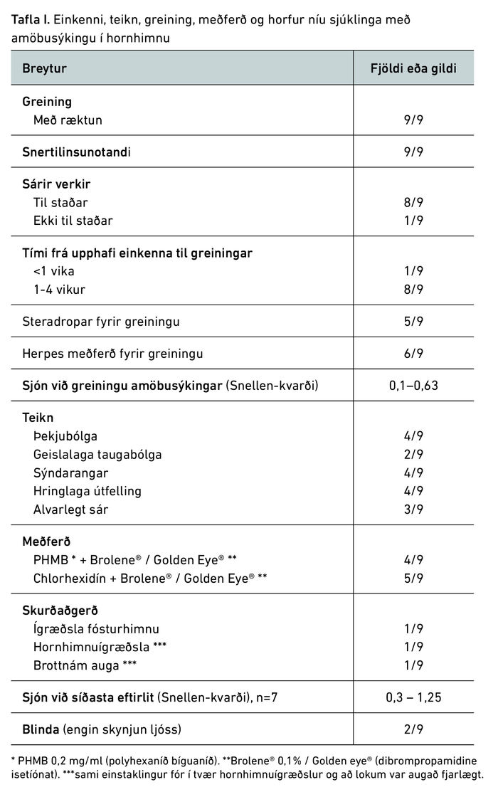 Meðferð var staðbundin og fengu allir sjúklingarnir meðferð með díamidínum (dibrompropamidine isetíónat) og bígúaníðum (polyhexaníð bíguaníð eða klórhexidín) í samræmi við klíníska venju.12,13 Flestir fengu að auki staðbundna sýklalyfjameðferð auk brárvöðvalamandi dropa. Allir fengu smyrjandi meðferð með gervitárum eða geli. Einn sjúklinganna þurfti sermisdropa útbúna af Blóðbankanum úr sermi viðkomandi. Meðferðarlengd með amöbuvirkum lyfjum var á bilinu 5-24 mánuðir og steradropar voru gefnir í 1-110 mánuði. Fimm sjúklingar fengu steradropameðferð fyrir amöbu greiningu. Eftirfylgni varði í 4-24 mánuði hjá átta einstaklingum en í 110 mánuði hjá einum einstaklingi. Til aðgerðar kom hjá tveimur sjúklingum. Annars vegar með endurteknu líknarbelgsígræði og hins vegar með endurtekinni hornhimnuígræðslu og loks brottnámi augans. Við síðustu skráðu skoðun hafði einn einstaklingur misst augað og annar hafði misst alla sjón á auganu. Sjónskerpa hinna sjö mældist á bilinu 0,3-1,25 á Snellen-kvarða.
