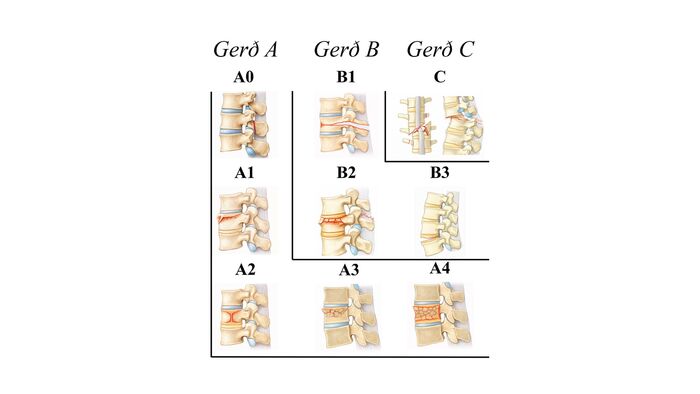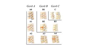 Ýmis flokkunarkerfi hafa verið þróuð til að flokka brjóst- og lendhryggbrot. Enn ríkir þó ágreiningur um hvaða kerfi er best í notkun.1 Alþjóðlega staðlaflokkunarkerfi kennt við samtökin AO Spine hefur verið notað á Landspítalanum og hér verður það kynnt. AO Spine-flokkunarkerfið byggist á þremur gerðum brota, gerð A, B og C, sem hver og einn skiptist síðan í undirflokka.2 Mynd 1 sýnir AO Spine Thoracolumbar-flokkunarkerfið.