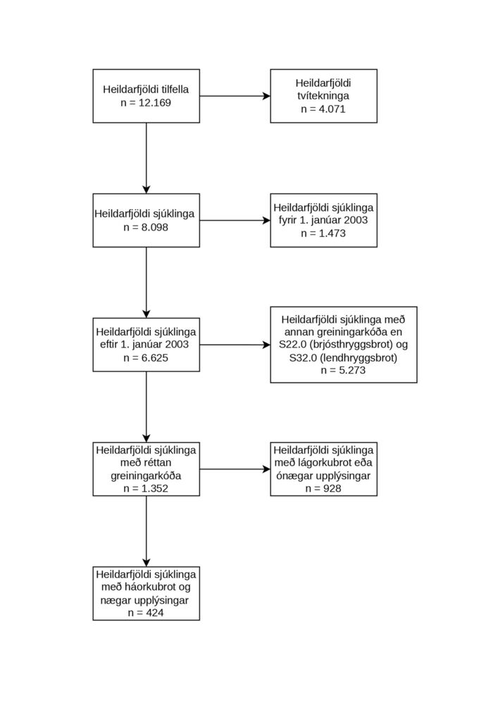 Notaðir voru ICD-10 greiningarkóðar til að finna sjúklingahópinn í rafrænum sjúkraskrám, samtals 12.169 skráningar. Gagnasafnið var síðan hreinsað með því að fjarlægja endurtekningar, aðra ICD-10 kóða og lágorkuáverka, samkvæmt sjúkraskrá. Eftir stóðu 424 kennitölur sem uppfylltu skilyrði um háorkuáverka og höfðu eftirfarandi greiningarkóða: S32.0 (lendhryggbrot) og S22.0 (brjósthryggbrot). Á mynd 2 má sjá hvernig rannsakendur afmörkuðu rannsóknarþýðið.