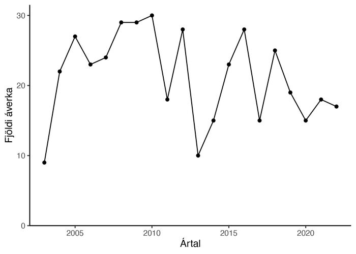 Á árunum 2003–2022 greindust 424 einstaklingar með brjóst- og lendhryggsbrot á Landspítalanum vegna háorkuáverka. Rannsóknarhópurinn sem uppfyllti inntökuskilyrði samanstóð af 264 körlum (62%) og 160 konum (38%). Meðalaldur þátttakenda var 40 ár (staðalfrávik 18 ár; aldursbil 4-87 ára). Það reyndist ekki vera marktækur munur á meðalaldri eftir kyni (p=0,63) (Welch‘s T próf), en meðalaldur karla var 41 ár og meðalaldur kvenna 40 ár. Alls voru 17% með erlent ríkisfang, eða 70 einstaklingar. Ekki reyndist vera marktækur munur á fjölda einstaklinga með erlent ríkisfang á fyrstu fimm árum tímabilsins samanborið við síðustu fimm ár rannsóknartímabilsins (p=0,79) (Welch‘s T próf) og línuleg aðhvarfsgreining sýndi ekki marktæka línulega aukningu eða minnkun í fjölda erlendra einstaklinga yfir tímabilið (p=0,80). Að meðaltali voru 21 áverki á ári á rannsóknartímabilinu en það var þó nokkur breytileiki í fjölda áverka eftir árum, allt frá 9 og upp í 30 áverka árlega. Áverkum fækkaði milli ára milli ára en sú breyting var ekki marktæk (p=0,16) (Poisson regression). Á mynd 3 má sjá myndræna framsetningu fjölda áverka á rannsóknartímabilinu.