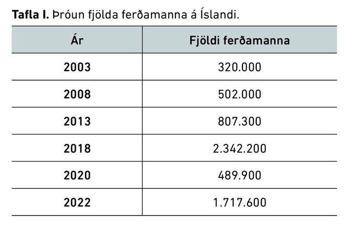 Athyglisvert er að ekki var marktæk aukning á brotum eða umferðaróhöppum meðal erlendra ferðamanna á rannsóknartímabilinu þrátt fyrir fjölgun þeirra á Íslandi.16 Tafla I sýnir þróun fjölda ferðamanna á Íslandi.