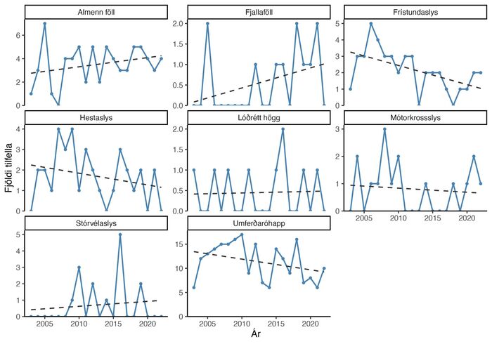 Nýgengi og fjöldi slysa er greinilega mjög lágt árið 2003, það má að hluta skýra af því að gæði myndrannsókna frá því ári voru takmörkuð, rannsakandi gat ekki alltaf staðfest AO-flokkun, tölvusneiðmyndir voru ekki alltaf teknar eða gögnum hafði verið eytt. Ef árið 2003 er undanskilið, lækkar nýgengið marktækt yfir tímabilið 2004 til 2022 (p<0,05)(Línuleg aðhvarfsgreining) en heildarnýgengið hækkar í 6,7 á hverja 100.000 íbúa. Tíðni áverka fer einnig marktækt lækkandi yfir tímabilið (p<0,05)(Poisson regression). Mynd 5 sýnir þróun áverka eftir orsakaflokkum yfir rannsóknartímabilið.