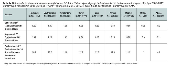 Megin inntak þessarar greinar eru niðurstöður úr EuroPrevall/iFAAM-rannsóknarverkefninu. Þar er fjallað um óþægindi af mat, sIgE fyrir 24 fæðutegundum, húðpróf fyrir fæðutegundum og þolpróf í ýmsum aldurshópum auk mögulegra áhættuþátta.7,16,21