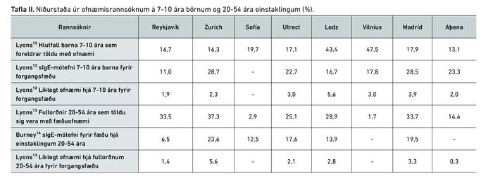 Hins vegar var ofnæmi tveggja ára barna fyrir mjólk og eggjum ekki minna í Reykjavík en í samanburðarborgunum.17,18 Þegar nýburunum var fylgt eftir til 6-10 ára aldurs var heldur ekki hægt að sjá að einkenni um fæðuofnæmi væri minna í Reykjavík en í hinum borgunum, en illu heilli voru niðurstöður fyrir einstakar borgir ekki gefnar upp.21 Þegar kannað var algengi ofnæmissjúkdóma hjá börnum í EuroPrevall rannsókninni, 8 ára að aldri, greindust 3,5% barna í Reykjavík með astma, 7,3% með ofnæmi í nefi og 8,5% með exem.21 Meðaltal fyrir borgirnar átta var 3,0%, 7,3% og 7,8%. Þannig að Reykjavík skildi sig ekki frá öðrum þátttökuborgum. Árið 2008 var kannað næmi 10 -11 ára skólabarna með húðprófum og algengi var þá svipað hér á landi og hjá öðrum þjóðum í Vestur-Evrópu.²⁴ Eigi að síður er sIgE og líklegt ofnæmi hjá 7-10 ára börnum, eins og hjá fullorðnum, lægra í Reykjavík en í samanburðarborgunum. (Tafla II).