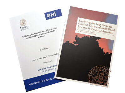 Föstudaginn 13. febrúar 2026 varði -Ólafur Pálsson doktorsritgerð sína í lækna-vísindum við læknadeild Háskóla Íslands og læknadeild Lundarháskóla. Ritgerðin ber heitið: Að kanna bilið milli rannsókna og raunveruleika í sóragigt (Exploring the Gap Between Clinical Trials and Real-World Practice in Psoriatic Arthritis).