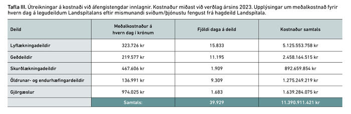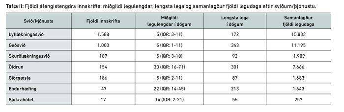 Tafla II sýnir fjölda innskrifta á mismunandi deildir Landspítalans, miðgildi legulengdar, lengstu legu og samalagðan fjölda legudaga á hvert svið/þjónustu fyrir sig. Hér voru notaðar upplýsingar þar sem aðliggjandi legur hjá sömu sjúklingum höfðu ekki verið sameinaðar og því verður orðið innskrift notað í stað innlagnar. Innskriftirnar voru alls 3179 og eru innskriftardeildirnar flokkaðar eftir 7 sviðum/þjónustu, það er geðsvið, lyflækningasvið, skurðlækningasvið, öldrun, gjörgæsla, endurhæfing og sjúkrahótel. Gróflega reiknaður kostnaður þessara innlagna, miðaður við verðlag 2023, er um 11 milljarðar króna (sjá töflu III).