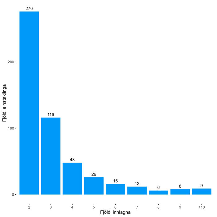Einstaklingar sem lögðust oftar en 10 sinnum inn voru 9 talsins en þeir lögðust samtals 141 sinni inn á tímabilinu.