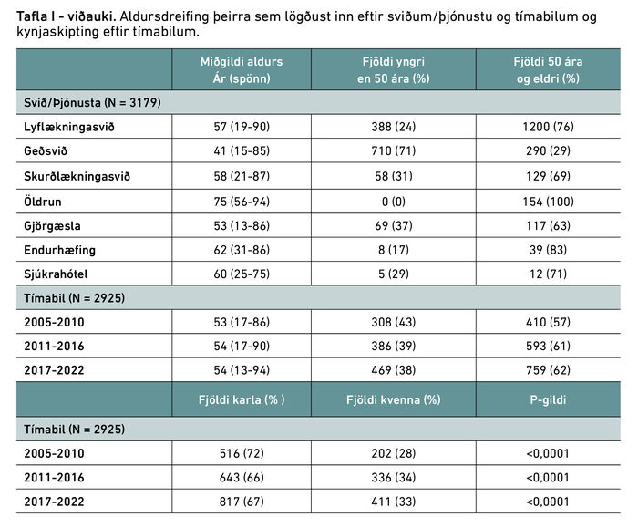 Þróun kynjahlutfallanna yfir tímabilin þrjú sést á mynd 3 og í töflu 1 í viðauka (neðst í grein). Á tímabilinu var miðgildi aldurs við innlögn 54 ár (IQR: 41-64, spönn: 13-94). Í töflu 1 í viðauka má sjá aldursdreifingu þeirra sem lögðust inn eftir sviðum/þjónustu og tímabilum. Miðgildi legulengdar var 6 dagar (IQR: 3-13, spönn: 1-379). Fyrstu fimm árin (2005-2010) var miðgildið 5 dagar (IQR: 2-13), 2011-2016 var það sex dagar (IQR: 3-13) og 2017-2022 var það einnig sex dagar (IQR: 2-13).