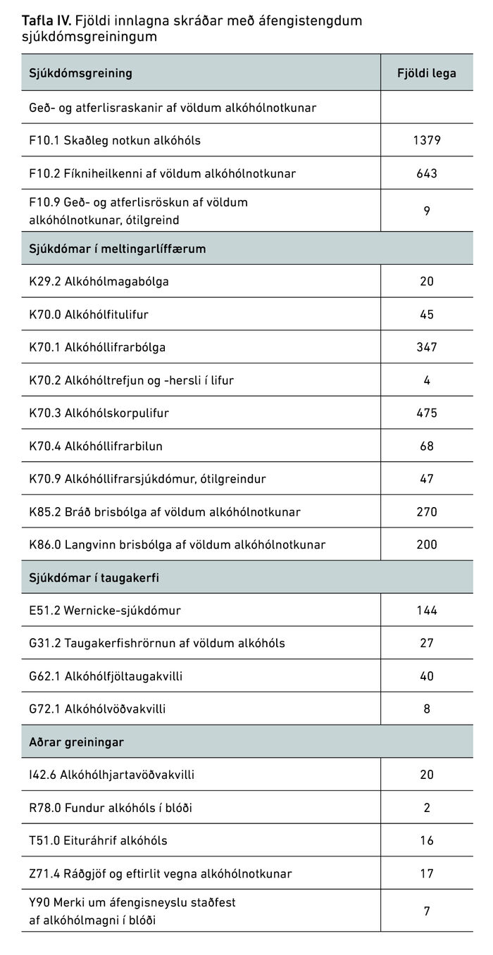 Tafla IV sýnir fjölda innlagna sem skráðar voru með þeim áfengistengdu sjúkdómsgreiningum sem leitað var eftir. Flestar innlagnirnar voru skráðar með einni eða fleiri greiningum úr flokki geð- og atferlisraskana af völdum alkóhólnotkunar en þær voru alls 1878.
