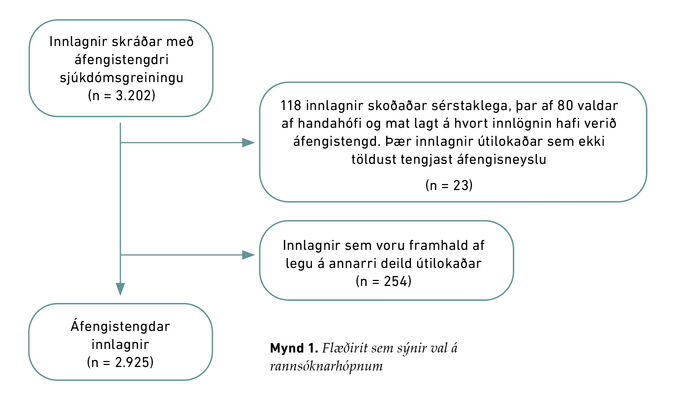 Það er líklegt að þessari aukningu á áfengisneyslu fylgi heilsufarslegar afleiðingar. Í skýrslu frá ríkisrekna heilbrigðiskerfinu í Bretlandi (National Health Service, NHS) koma fram tölur um áætlaðan fjölda áfengistengdra innlagna frá maí 2019 til apríl 2020 á spítala í Bretlandi. Þar eru notaðar tvær skilgreiningar (measures) á því hvað telst vera áfengistengd innlögn: breið (broad measure) og þröng (narrow measure). Undir breiðu skilgreininguna falla þær innlagnir þar sem áfengistengt vandamál var skráð sem annaðhvort aðalgreiningin (primary diagnosis) eða aukagreining (secondary diagnosis). Þessi skilgreining tekur því með þær innlagnir þar sem áfengistengt vandamál var aðalástæða innlagnarinnar og þær innlagnir þar sem áfengistengt vandamál var meðvirkandi þáttur í innlögn. Þrönga skilgreiningin telur einungis þær innlagnir þar sem áfengistengt vandamál var skráð sem aðalgreining. Þegar þrönga skilgreiningin var notuð var áætlað að um 280.000 innlagnir á spítala í Bretlandi hafi verið áfengistengdar en þær voru 1,6% af öllum innlögnum á spítala í Bretlandi það árið.4 Það varð 2% aukning á áfengistengdum innlögnum frá árinu 2018/19 og 8% aukning frá árinu 2016-17.4 Þegar breiða skilgreiningin var notuð voru áfengistengdu innlagnirnar 980.000 en það er 5,7% af öllum innlögnum það árið.4 Íslenskar rannsóknir hafa sýnt fram á mikla aukningu í nýgengi á skorpulifur,5-8 á síðustu áratugum samfara aukinni áfengisneyslu og einnig aukningu á brisbólgu af völdum áfengis.9 Aftur á móti hefur lítið verið rannsakað hvernig aukin áfengisneysla í samfélaginu hefur haft áhrif á innlagnir vegna skaðlegrar notkunar áfengis. Ljóst er að umtalsverðan fjölda koma og innlagna á Landspítalann má rekja til skaðlegrar notkunar áfengis en óljóst er um hversu margar innlagnir er að ræða. Markmið þessarar rannsóknar var að meta umfang áfengistengdra innlagna á Landspítala á árunum 2005-2022 en slík athugun hefur ekki verið gerð áður hér á landi svo að höfundar viti til.