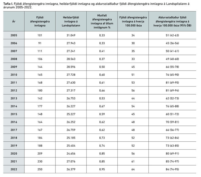 Árlegur meðalfjöldi áfengistengdra innlagna á 18 ára rannsóknartímabilinu var 48 innlagnir á hverja 100.000 íbúa. Á fyrstu 6 árum rannsóknartímabilsins (2005-2010) var árlegur meðalfjöldi 38 innlagnir á hverja 100.000 íbúa. Næstu sex árin (2011-2016) var árlegur meðalfjöldi 51 innlögn á hverja 100.000 íbúa og á síðasta tímabilinu (2017-2022) var árlegur meðalfjöldi kominn upp í 56 innlagnir á hverja 100.000 íbúa. Mestur fjöldi áfengistengdra innlagna var árið 2022 en þá voru innlagnirnar 250 talsins, það er 64 innlagnir á hverja 100.000 íbúa. Hlutfall áfengistengdra innlagna af öllum innlögnum á Landspítalann jókst einnig á rannsóknartímabilinu. Að meðaltali var þetta hlutfall 0,42% á tímabilinu 2005-2010; 0,61% 2011-2016 og 0,79% á tímabilinu 2017-2022. Árið 2005 var hlutfallið 0,33% og árið 2022 var hlutfallið komið upp í 0,95%. Aldursstaðlaður fjöldi áfengistengdra innlagna á hverja 100.000 íbúa sést í töflu I. Við upphaf tímabilsins, árið 2005, var aldursstaðlaður fjöldi áfengistengdra innlagna 51 innlögn/100.000 íbúa og árið 2022 var fjöldinn 84 innlagnir/100.000 íbúa.