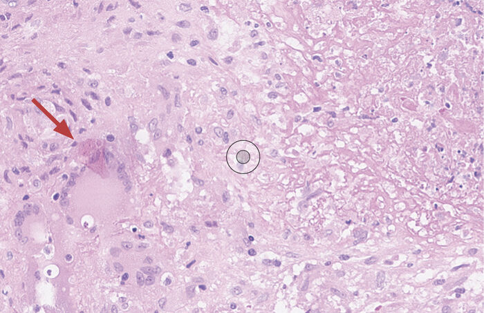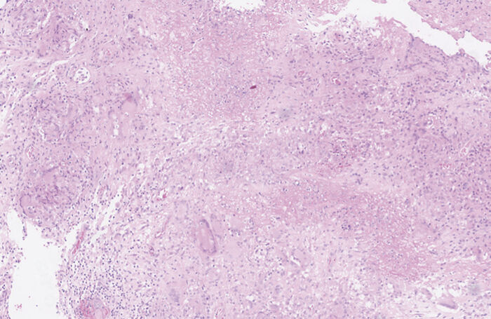 Í svari meinafræðideildar sást vefur úr sári með kröftugri bráðri bólgu og hnúðabólgu (granulomatous inflammation) með drepi (Mynd 1).