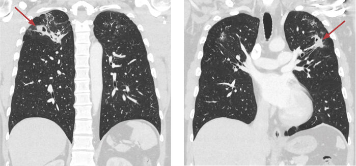 Mynd 2. Tölvusneiðmynd af lungum hjá sjúklingi sem sýnir íferðarfláka ofan til í báðum lungum með holumyndun (cavitation) (rauð ör).